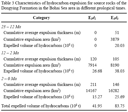 The results of hydrocarbon expulsion amount evolution suggest that the source rocks in E3d3 began to expel hydrocarbons at about 16.6-12Ma ago, and the hydrocarbon expulsion center was located in the Bozhong sag. From 12 Ma to 2 Ma, source rocks in the Bozhong sag reached the hydrocarbon expulsion peak, and the hydrocarbon expulsion extent increased to seven hydrocarbon expulsion sags. From 2 Ma to present, although the amount of hydrocarbon expulsion diminished sharply in the Bozhong sag, it increased slightly in other sags, indicating that the source rocks in medium to small sags just entered their hydrocarbon expulsion peak during this period.
