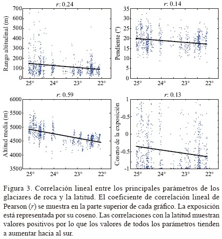 Dentro del sector cordillerano argentino Brenning y Trombotto (2006) establecen el límite inferior de los glaciares de roca activos a 3250 m s.n.m. para los 33-34° S, mientras que para los 30° S (cerca del límite con Chile) Schrott (1996) lo sitúa a 4000 m s.n.m. Para esa misma latitud, pero en el sector noreste de la Cordillera Frontal, Esper Angillieri (2009) ubica el límite inferior a 3621 m s.n.m. A lo largo de la COA se observa que la cota más baja a partir de la cual aparecen los distintos tipos de glaciares de roca no varía en sentido norte-sur (Figura 2a). Sin embargo, tanto la cantidad como la superficie de glaciares de roca activos e inactivos aumenta considerablemente hacia el sur, principalmente entre los 24° y 25° S (Figura 2b). También existe una tendencia de aumento hacia el sur de la cota inferior (Figura 2a) media y del rango altitudinal (Figura 3). Esta distribución y tendencia, más que responder a cuestiones climáticas, está ligada a cuestiones topográficas. Esto se debe a que tanto las altitudes máximas como el área por encima de 4500 m (límite inferior de los glaciares de roca activos) aumentan considerablemente entre los 24-25°S y con ello, la superficie del paisaje criogénicamente activa (Figuras 2a y 2c). Además, existe una tendencia de aumento de la exposición norte (correlación positiva del coseno del ángulo de exposición con la latitud, Figura 3) hacia el extremo austral de la COA, donde mayores altitudes posibilitan el desarrollo de glaciares de roca orientados hacia las laderas más cálidas de las sierras (Figura 6).