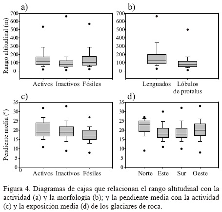El rango altitudinal (diferencia entre la altitud máxima y mínima de un mismo glaciar de roca) alcanza en casos extremos casi 700 m, pero el promedio es de 122 m (Figura 3). Los glaciares de roca inactivos son los que presentan menor rango altitudinal con respecto a los otros casos (Figura 4a).