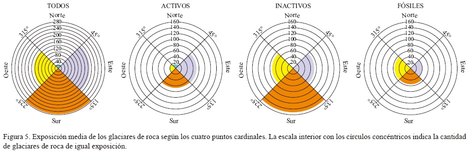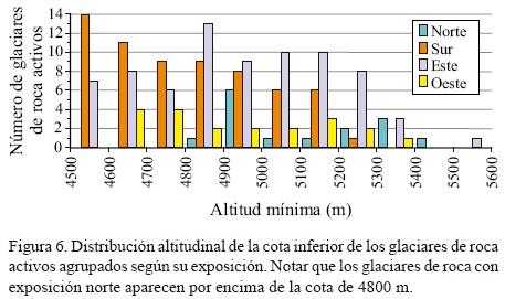 La orientación predominante de la pendiente (exposición) de los glaciares de roca (Figura 5) es hacia el sur (43.5%), seguida por la orientación hacia el este (30%), la orientación oeste (23%) y, por último, muy pocos presentan orientación hacia la cara más cálida, la norte (3.5%). A diferencia de los glaciares de roca inactivos y fósiles donde la exposición dominante es hacia el sur (50% y 39%, respectivamente), la exposición dominante de los glaciares de roca activos es hacia el este (43%). Además, los glaciares de roca activos con exposición hacia el norte aparecen a partir de la cota 4830 m, esto es, 380 m por encima de la de los glaciares de roca con exposición hacia el este y sur (Figura 6).