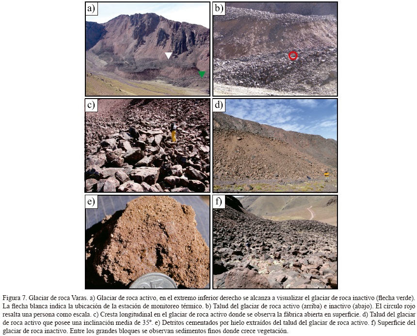 El glaciar de roca Varas presenta claros rasgos de actividad como (a) irregularidades en su superficie en forma de crestas y surcos longitudinales (Figura 7c) de más de 2 m de desnivel, (b) un abrupto talud con una pendiente media de 35° que se diferencia del resto del cuerpo del glaciar de roca por presentar sedimentos de granulometría fina (tamaño arena y menores) y (c) un área de aporte muy empinada sin vegetación alguna, con importantes signos de reptaje y donde es común observar la caída de bloques por gravedad.