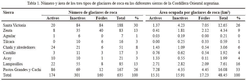 Los glaciares de roca constituyen geoformas abundantes dentro de la Cordillera Oriental argentina (COA), donde cerca de la mitad se concentra en el sector austral entre 24°23' y 25°3' S. En total se contabilizaron 635 glaciares de roca, los cuales fueron clasificados de acuerdo con criterios morfológicos de actividad en activos (27.5%), inactivos (47.5%) y fósiles (25%). Cubren un área de 48.45 km2 y en general se trata de cuerpos de pequeñas dimensiones (<0.1 km2). Los glaciares de roca activos se encuentran por encima de la cota de 4500 m, los inactivos por encima de la de 4200 m y los fósiles por encima de la de 3800 m.