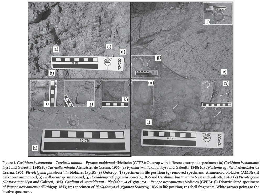 Biofacies AMB corresponds to ammonoids and some bivalves, gastropods, serpulids, few echinoids and minor concentrations of shell detritus (Figure 4 h-k). Overall, fossil individuals are not common in this biofacies, and among them, the most abundant organisms are ammonoids with little or no reworking, compared to the other fossilized organisms. Ammonoids correspond to casts and external molds ofPhylloceras Suess, 1865 and Lytoceras Suess, 1865 (González-Arreola, 1974), which have a low corrasion grade, are matrix filled and mostly concordant to bedding. Bivalve specimens are mainly Panope neocomiensis d'Orbigny, 1843, Pterotrigonia plicatocostata Nyst and Galeotti, 1840 and Pholadomya cf. gigantea Sowerby, 1836. Bivalves are disarticulated and valve orientation is variable but is mostly convex-down. Specimens have a high corrasion grade with exception of Pterotrigonia plicatocostata Nyst and Galeotti, 1840 and Pholadomya cf. gigantea Sowerby, 1836 which have a medium corrasion grade. Serpula sp. tubes are preserved as small sub-cylindrical fragments concordant to bedding. Gastropods are preserved as complete external mold casts, which are concordant to bedding and have high corrasion levels; they correspond to Cerithium bustamantii Nyst and Galeotti, 1840 and Turritella minuta Nyst and Galeotti, 1840. A few radiolas from Pseudocidaris clunifera Agassiz, 1840 were also found (Buitrón, personal communication).