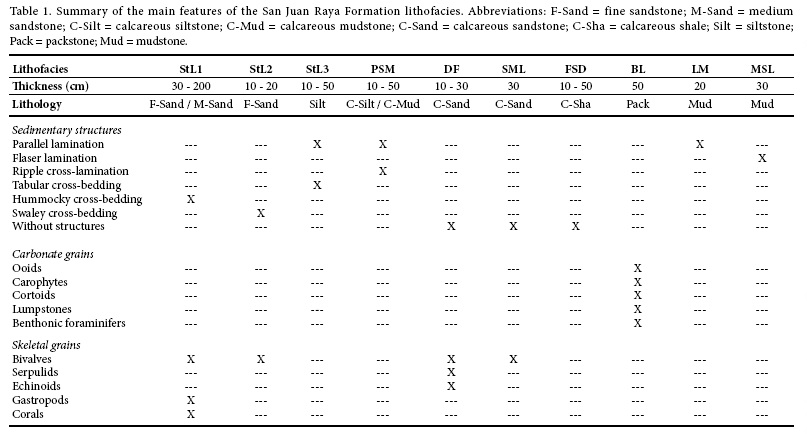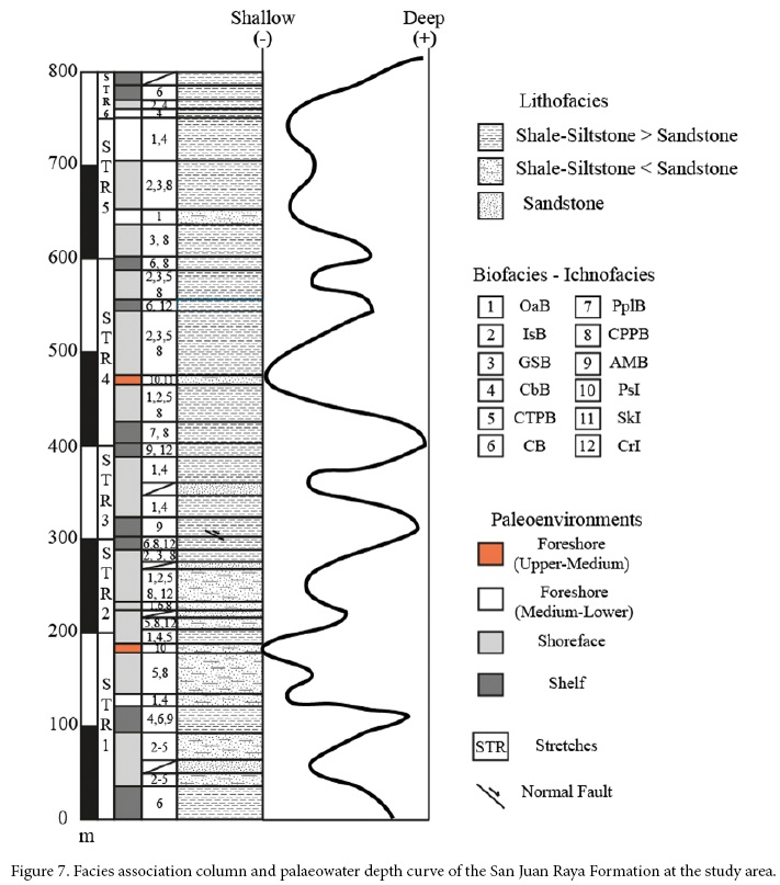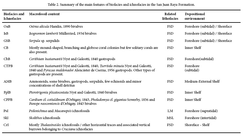 The presence of Ostrea alicula (OaB), Isognomon lamberti (IsB) and gregarious serpulid (GSB) biofacies and Psilonichnus ichnofacies (PsI), reflect stressful environmental conditions with a lower sedimentation rate and different water salinity levels in the San Juan Raya Formation. Normal conditions in water salinity are represented by the rest of the biofacies and ichnofacies.