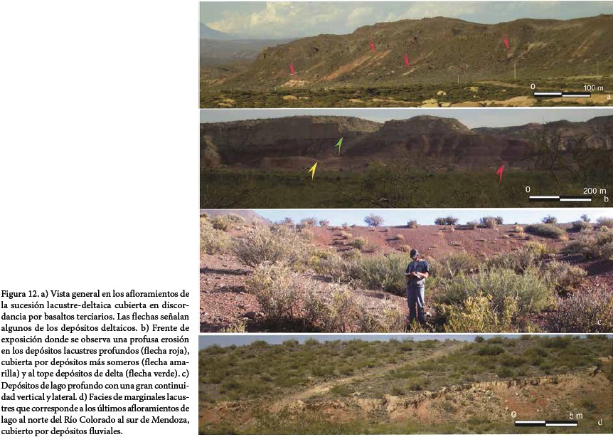 Los deltas de tipo Gilbert fueron alimentados por un sistema de canales fluviales distributarios (Nichols y Fisher, 2007), cuya área de captación, de acuerdo con las direcciones de paleocorrientes, se habría ubicado hacia el oeste, cubriendo una paleotopografía de alto relieve, y se extendieron dentro del lago durante periodos de inundación excepcional como deltas de magnitud intermedia (Sánchez, 2010; Sánchez y Asurmendi, 2011), reconocidos en afloramientos y subsuelo (Figuras 12 y 14; Sánchez, 2006; Sánchez et al., 2007a, 2007b, 2008). Se ha sugerido que al momento de su formación se requiere un buzamiento de la pendiente de depósito mínima de 3° (Postma, 1990; Ritchie et al., 2004), aunque otros autores han marcado que un escalón en la pendiente subácuea puede facilitar el depósito de los foresets. Otros autores enfatizan que existe un periodo de resilencia entre el inicio de la subsidencia, que da origen a la batimetría inicial, y el sumistro de sedimentos ( Uliĉý et al., 2002) o contrariamente que el comienzo de la subsidencia inicial creada por la actividad del frente orogénico es coetánea con la generación del delta debido a un incremento abrupto en la batimetría (Gawtorpe y Colella, 1988; Ori et al., 1991).