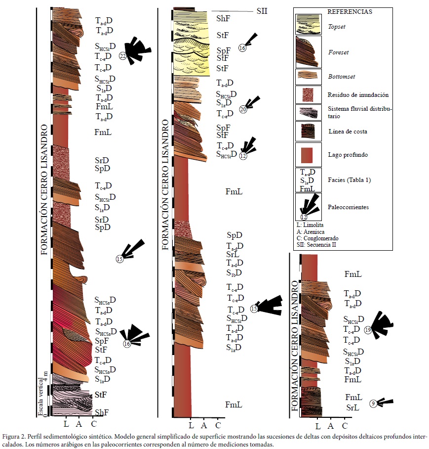 Los métodos usados para la colección y análisis de datos de la Formación Cerro Lisandro en el centro-oeste de cuenca Neuquina son propios del enfoque sedimentológico y estratigráfico: relevamiento de tres secciones de más de 15 km con identificación de las diferentes unidades sedimentarias que la integran (Figuras 1b y 1c). En las mismas se procedió a la identificación de la litología, estructuras sedimentarias, geometría de los depósitos y adquisición de datos de paleocorrientes que fueron luego analizados estadísticamente. También fueron fotografiados extensos afloramientos con el objetivo de identificar y documentar los eventuales elementos arquitecturales presentes de acuerdo con la metodología propuesta por Miall (1985). Además, se llevó a cabo la elaboración de un perfil integrado en escala aproximada 1:20 (Figura 2), con el objeto de brindar una documentación detallada de las facies. La identificación e interpretación de las mismas, conjuntamente con el análisis de las asociaciones y elementos arquitecturales de meso y macroescala permitió la identificación de procesos involucrados en la conformación de las unidades lacustre-deltaicas y su evolución.