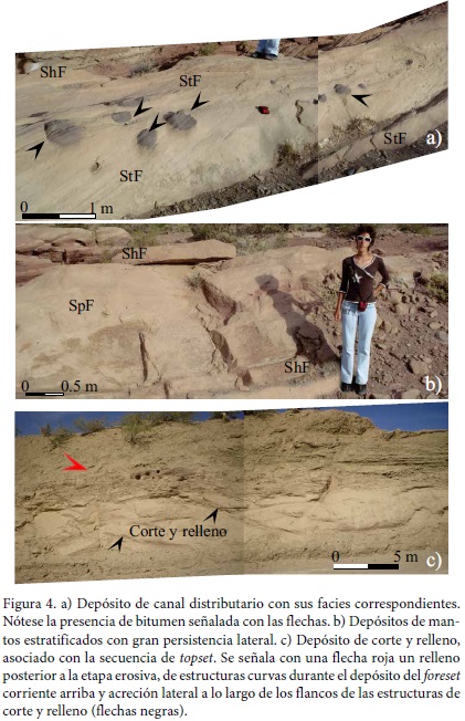 Asociaciones de facies de canales distributarios. Esta asociación (Figura 4a) consiste principalmente de areniscas con estratificación paralela o cruzada de bajo ángulo (ShF), cruzada en artesa (StF) cruzada planar (SpF) y pelitas laminadas o macizas (FlF). Los estratos muestran una tendencia grano y estratodecreciente, presentan una geometría lenticular y superficie basal erosiva planar o cóncava de bajo relieve. El apilamiento de las unidades individuales conforma depósitos tabulares de hasta 5 m de espesor, con extensión lateral de 200 m. Presentan nódulos carbonáticos con elevada concentración de bitumen. Las superficies de erosión comúnmente interrumpen la continuidad entre el topset y el foreset resultando en una alternancia de la geometría offlap sigmoidal y oblicua. Los depósitos canalizados se observan en la porción superior del delta; presentan un espesor máximo de 5 m y aparecen verticalmente apilados. Los sets de estratificación cruzada en artesa desarrollan gradación normal (Figura 4a). Estos depósitos de canal distributario presentan impregnaciones de hidrocarburos.