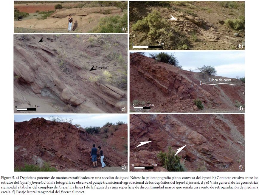 El complejo de foreset incluye las asociaciones de facies de eventos de crecida y de corte y relleno. Está constituido mayormente por areniscas de guijarros dispersos y de grano grueso a fino, moderadamente seleccionadas y pelitas subordinadas. Los clinoestratos individuales presentan un espesor de 1.2 m a 8 m, muchos de ellos están amalgamados, y definen una arquitectura general tabular o sigmoidal característica (Figura 5d y 5e). Los sedimentos han sido transportados pendiente abajo a través de procesos gravitatorios, incluyendo flujos de alta densidad que evolucionaron, a partir de flujos hiperpícnicos, hasta turbiditas. Los canales frecuentemente están incididos por canales relacionados con flujos turbulentos, en algunos casos asociados con procesos de dilución de flujos densos o producto de la progradación repentina de canales distributarios durante eventos de crecida excepcionales. La transición del foreset al toeset es comúnmente tangencial (Figura 5f).