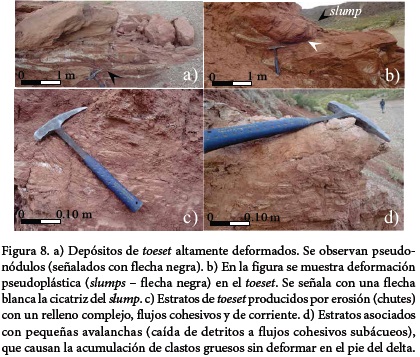 Interpretación: esta asociación de facies se interpreta como el producto del salto hidráulico debido a la expansión y fuerte reducción de la velocidad y competencia del flujo al llegar a la base de la pendiente del foreset, en el pie del escarpe del frente deltaico. El principal mecanismo de formación para estos depósitos es la sedimentación a partir de flujos gravitatorios de sedimentos, esencialmente de alta densidad (Lowe, 1982) a los que se asocian procesos de fluidización y deformación pseudoplástica. El alto gradiente de la pendiente del foreset junto con la energía de las corrientes gravitatorias puede localmente producir canales incididos (chutes; Figura 8c). En algunos casos la acumulación de estratos deformados arenosos en el foreset/toeset representan una categoría de flujos caracterizados por un comportamiento cohesivo durante su propagación por inestabilidad gravitacional (Figura 8d). La truncación del foreset, en algunos casos, es interpretada como el resultado de deslizamientos sinsedimentarios internos (cicatrices de slump; Figura 8b) que remueven al material como una masa coherente (Nemec, 1990).