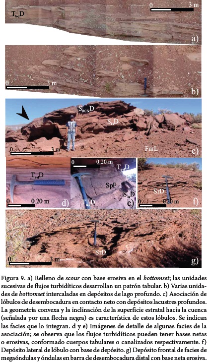 Los depósitos de desembocadura de río en un cuerpo lacustre comúnmente desarrollan una típica geometría sigmoidal, en diferentes escalas físicas como una función de la magnitud y duración de los flujos individuales de inundación (Mutti et al., 2000). La Formación Cerro Lisandro (Figura 10 a-c) constituye un ejemplo del desarrollo de un sistema fluvio-deltaico, con unidades de depósito de deltas y lóbulos de desembocadura dominados por inundaciones fluviales de gran magnitud (Figura 9c). Las facies y asociaciones de facies de estos sistemas fluvio-deltaicos comprenden un amplio espectro de sedimentos arenosos poco conocidos y pobremente descritos, los que varían desde estratos de areniscas sabulíticas hasta pelitas finamente laminadas.