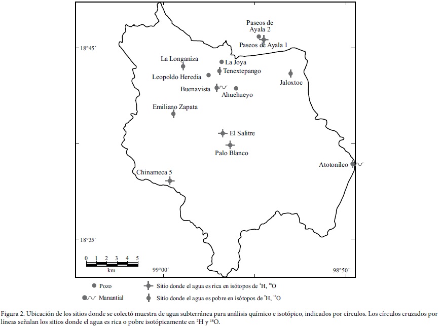 De las muestras aquí analizadas, el agua más empobrecida isotópicamente se encuentra en el norte y noreste de la zona y se relaciona con una mayor altitud del afloramiento de la roca donde se efectúa la recarga, mientras que el agua más enriquecida se ubica en la porción sur y centro, relacionada a una menor altitud del relieve, lo que concuerda con condiciones similares reportadas al norte de la zona de interés por Jaimes-Palomera et al. (1989) y Vázquez-Sánchez et al. (1989).