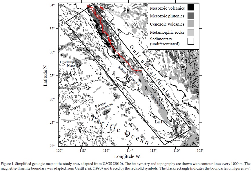 As mentioned above, in previous works (Langenheim and Jachens, 2003, García-Abdeslem and Martínez-Cañedo, 2009), the amplitude and continuity of regional magnetic anomalies (Figure 2b) suggest an almost continuous belt of mafic plutons that extends over the length of the Baja California Peninsula. Also, the remarkably difference between these regional magnetic anomalies and those of low intensity observed towards the east of Peninsula, is consistent in general with a variety of hypothesis and models drawn from many geological studies, summarized and discussed by several authors (Gastil et al., 1981; Sedlock et al., 1993; Sedlock, 2003; Wetmore et al., 2003; Busby, 2004) and from the geophysical interpretation of paleomagnetic data (Böhnel and Delgado-Argote, 2000; Schaaf et al., 2000; Böhnel et al., 2002; Symons et al. , 2003), although uncertainties, disagreements, and controversies persist, as pointed out by Sedlock (2003). It is generally agreed that during the Paleozoic and early Mesozoic, the western margin of North America was a passive continental margin where a broad platform was developed. This tectonic setting changed in Late Triassic through Early Jurassic time, when a continental magmatic arc was developed as a consequence of the subduction of the Farallon plate under the North American continent. In Early Cretaceous time, between 140 and 100 Ma (Ortega-Rivera, 2003), the active magmatic arc was located at the site of the eastern Peninsular ranges batholith. However, the differences in the chemical composition and isotopic signatures across the Peninsular batholiths are evident in mafic and magnetite-rich plutons of gabbro, norite, and tonalite on the west, and ilmenite-rich felsic plutons of granite and tonalite on the east. These differences suggest that the western Alisitos arc and the northern equivalent Santiago Peak of southern California, both, represent an island arc that evolved over an east-dipping subduction zone, accreted to the western margin of the North American continent during Late Jurassic to mid-Cretaceous time. The congenital suture of this accretion defines the magnetite-ilmenite boundary (Gastil et al., 1990).