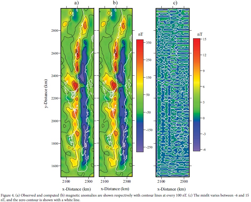 Apart from the expected edge effect typically occurring due to the limited lateral extension of the model, that was eliminated by excluding the prims at the perimeter of the model, the results of the linear inverse modeling indicate that the long wavelength magnetic anomaly was very well explained by the inferred distribution of magnetization. Figure 4 shows the observed and computed magnetic anomalies and their misfit, which varies between -6 to 15 nT.
