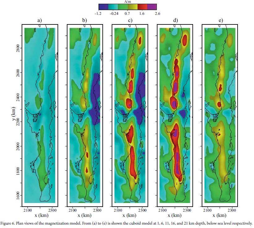 Figure 5 shows the lateral distribution of magnetization in layers 1 and 2. In layer 1 the magnetization is different than zero only in the highest part of the Peninsular Ranges Batholith, varying mainly in the range of ±0.004 A/m, and localized towards the east of the magnetite-ilmenite boundary. In layer 2 the negative magnetization intensity, as illustrated in Blakely (1996, p. 95), may be attributed to surface sedimentary formations in the Sebastián Vizcaíno region and along the Pacific north coast. Positive but low magnetization present elsewhere may be due to felsic volcanic rocks and volcano-sedimentary sequences with some disseminated magnetic minerals (see Table 2). Obviously, petrophysical and paleomagnetic data are needed to sustain this qualitative interpretation of the inverse modeling results.