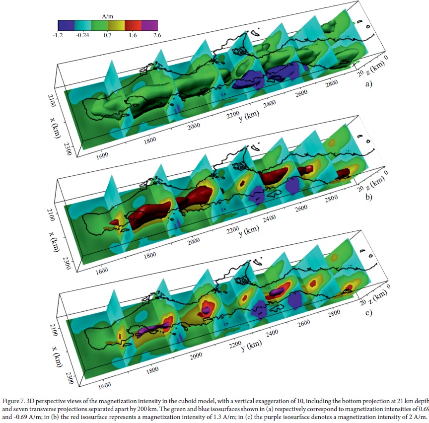 The lateral distribution of magnetization intensity is shown in Figure 6 at selected depths between 1 and 21 km depth. 3D perspective views in Figure 7 display the magnetization intensity on several orthogonal planes, along with some selected isosurfaces of constant magnetization intensity.