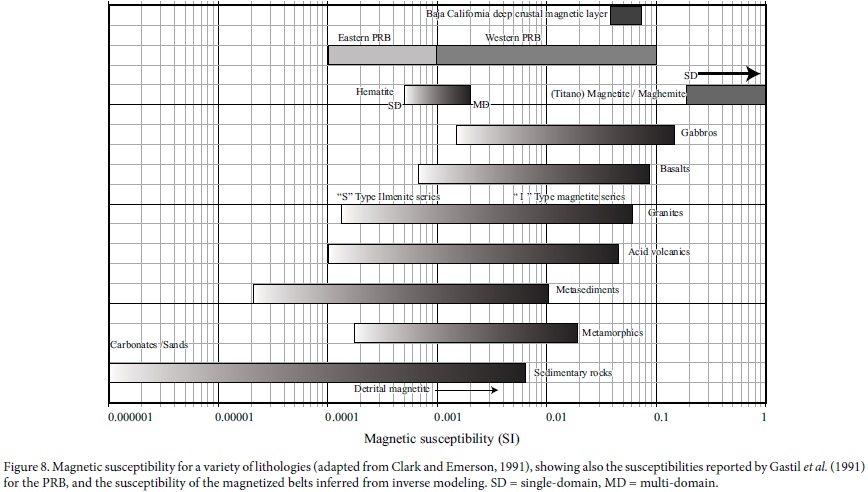 The magnetite-ilmenite boundary (Figure 1) separates magnetite-bearing granitic rocks in the western portion of the PRB from ilmenite-bearing granitic rocks in the eastern portion of the PRB. Using magnetic susceptibility measurements on the batholiths of southern California and Baja California, Gastil et al. (1990) traced this boundary southward to the border between Baja California and Baja California Sur states at latitude 28°N. In the western batholiths, the magnetic susceptibility varies between 1x10-3 and 1x10-1 (SI). In the eastern batholiths the magnetic susceptibility roughly varies between 1x10-4 and 1x10-3 (SI). Magnetite (Fe3O4) is a ferrimagnetic material that looses its magnetization when temperatures rise above its Curie point (~580 °C). Magnetite is generally considered to be the main carrier of the magnetization in the crustal magnetic layer, and consequently the main source of magnetic anomalies. Ilmenite (FeTiO3) is antiferromagnetic, but behaves paramagnetically at room temperature (Tarling, 1983).