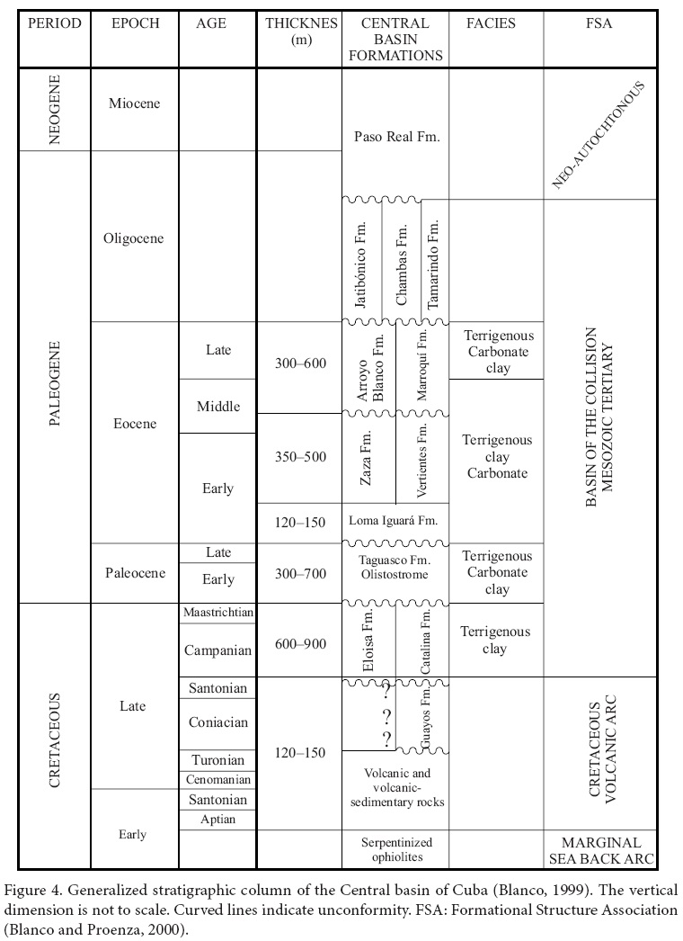 Tertiary sedimentary infill of the Central basin may exceed 3000 m in thickness and includes a lower synorogenic and an upper post-orogenic sequence separated by an unconformity (Cruz-Orosa et al., 2012). Terrigenous-carbonate-clay facies are deposited in the Paleocene (Taguasco Fm.). Terrigenous-clay-carbonates are later deposited with thicknesses of hundreds of meters of conglomerate, sandstone, polymictic aleurolite and calcareous clay argillite (Loma Iguará Fm.). Terrigenous-clay-carbonate facies continued their deposition during the Middle Eocene (Zaza and Vertientes Fm.; Sánchez-Arango, 1977; Millán, 1986). Also, terrigenous-carbonate-clay facies are deposited in the Oligocene (Jatibónico, Chambas and Tamarindo Fm). Carbonate facies forming the Paso Real Fm. are deposited during the Miocene.