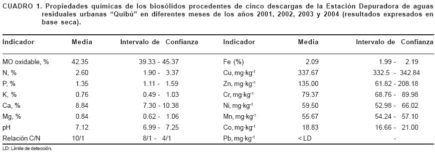 Los biosólidos utilizados procedieron de la Estación Depuradora de Aguas Residuales (EDAR) "Quibú" del municipio Marianao, Ciudad de La Habana, Cuba. Los mismos son obtenidos mediante un proceso de digestión anaeróbica y su producción varía de 413521 toneladas anuales. La procedencia de estos residuos es fundamentalmente de origen residencial (entorno del Palacio de las Convenciones) y los niveles de metales pesados detectados, se encuentran dentro de los límites permisibles establecidos por (NOM004ECOL2001, México) y el BOE (1990) para su uso agrícola. Las propiedades químicas de los biosólidos estudiados se muestran en el Cuadro 1.