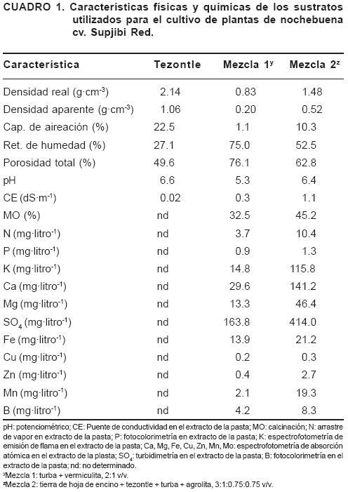 El experimento se estableció en un invernadero de cristal tipo capilla del Instituto de Horticultura de la Universidad Autónoma Chapingo, México. Se utilizaron esquejes enraizados y pinzados de nochebuena cv. Supjibi Red de 10 cm de altura con dos y tres hojas. El transplante se realizó el 25 de junio de 2004, en macetas de plástico de 6". Se utilizó un diseño factorial (3 sustratos x 3 formas de fertilización foliar), en bloques al azar con 9 tratamientos y 13 repeticiones, la unidad experimental fue una planta. Los sustratos utilizados fueron: tezontle, mezcla 1 (turba + vermiculita, 2:1 v/v) y mezcla 2 (tierra de hoja de encino + tezontle + turba + agrolita, 3:1:0.75:0.75, v/v). En el Cuadro 1 se presentan las características químicas y físicas de los sustratos evaluados. La fertilización evaluada consistió en la aplicación foliar de dos efluentes de vermicomposta, uno obtenido en el 2003 (1) y otro en el 2004 (2), más un control sin fertilización foliar. Los efluentes fueron obtenidos del vermicomposteo de rastrojo de maíz, malezas y estiércol de caballo y borrego. Los tratamientos fueron: a) tezontle sin fertilización foliar, b) tezontle + efluente 1, c) tezontle + efluente 2, d) mezcla 1 sin fertilización foliar, e) mezcla 1 + efluente 1, f) mezcla 1 + efluente 2, g) mezcla 2 sin fertilización foliar, h) mezcla 2 + efluente 1 e i) mezcla 2 + efluente 2. Los efluentes se aplicaron foliarmente cada 10 días a concentración de 0.05% (0.5 ml·litro1 ) hasta los 145 ddt). Los tratamientos con tezontle se regaron diariamente con solución nutritiva; en los tratamientos con la mezcla 1 los riegos con solución nutritiva se hicieron dos veces por semana, los riegos con agua se hicieron una vez por semana durante los primeros 30 días y después diariamente; en los tratamientos con la mezcla 2, los riegos con solución nutritiva se hicieron una vez por semana y con agua cada tercer día. La solución nutritiva contenía: N, P, K, Ca, Mg, Zn, Fe, B, Cu y Mn a concentración de 250, 50, 120, 200, 46, 0.5, 1.5, 0.5, 0.25 y 0.75 mg·litro1, respectivamente. Todos los riegos consistieron en aplicar 100 ml por maceta. Para la inducción floral, a partir de los 66 ddt y hasta el final del experimento (152 ddt), se manejó un fotoperiodo corto de 10:14 h luz:obscuridad, cubriendo las plantas con plástico negro calibre 600 de alta densidad.
