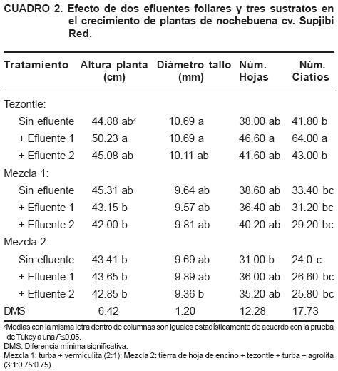 El mayor crecimiento se presentó en las plantas desarrolladas en tezontle como sustrato más fertilización foliar con el efluente 1. Estas plantas resultaron más altas (50.2 cm), con un mayor diámetro del tallo (10.7 mm) y número de hojas (46.6), pero fueron iguales estadísticamente a los valores obtenidos por plantas desarrolladas en el mismo sustrato pero sin aplicación foliar, o bien fertilizadas con el efluente 2 (Cuadro 2). El número de ciatios fue estadísticamente mayor también con el tratamiento con tezontle más efluente 1 (Cuadro 2).