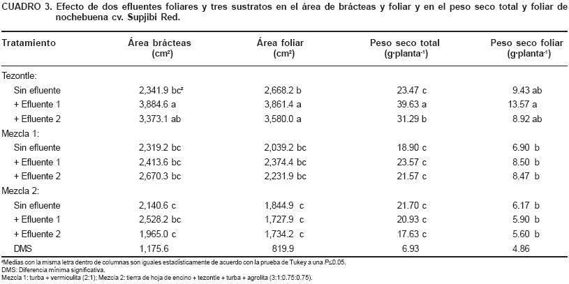 También se observó un efecto significativo del tratamiento con tezontle más el efluente 1 en el área de brácteas (3,884.6 cm2), área foliar (3,861 cm2), peso seco total de la planta (39.6 g) y peso seco foliar (13.6 g) (Cuadro 3). El área de brácteas, área foliar y peso seco foliar fueron estadísticamente iguales a los del tratamiento con tezontle más el efluente 2. Sin embargo, los porcentajes de incremento fueron diferentes entre los dos efluentes, el área de brácteas del tratamiento con tezontle + efluente 1 fue mayor en 66%, el área foliar en 45%, el peso seco total en 68% y el peso seco foliar en 44%, con respecto al tratamiento sin efluente. Con el efluente 2, se incrementó el área de brácteas en 44%, el área foliar en 34% y el peso seco total en 33%, el peso seco foliar no mostró incremento. El tratamiento con la mezcla 1 presentó incremento en el área de brácteas del 4 y 15%, en área foliar de 16 y 9%, en peso seco total de 25 y 14% y en peso seco total de 23%, con los efluentes 1 y 2, respectivamente. El uso de los efluentes con la mezcla 2 no mostró efecto significativo sobre estas variables (Cuadro 3).