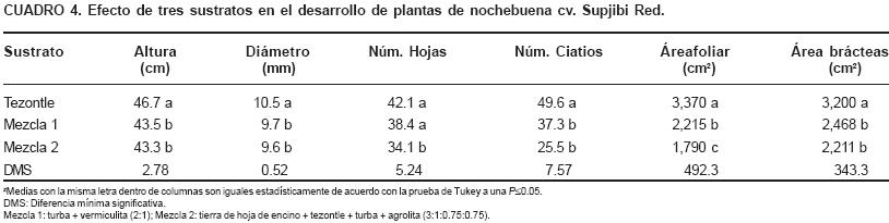 El análisis estadístico manifestó efecto significativo del sustrato sobre las variables de crecimiento; se observó un efecto significativo del tezontle en todas las variables estudiadas (Cuadro 4). La altura de las plantas que crecieron en tezontle se incrementó en 7%, el diámetro entre 8 y 9%, el número de hojas entre 9 y 19%, el número de ciatios entre 25 y 49%, el área foliar entre 34 y 47% y el área de brácteas entre 23 y 31%, con respecto a las mezclas 1 y 2.
