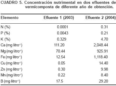 El análisis nutrimental de los dos efluentes manifestó que el efluente 2, obtenido en el año de 2004, presentó una concentración considerablemente mayor que el efluente 1 en todos los elementos evaluados (Cuadro 5). De tal manera que, la concentración de N fue 100% mayor que la del efluente 1, la de P 98%, la de K 93%, la de Ca 95%, la de Mg 92%, la de Fe 99%, la de Cu 100%, la de Zn 97%, la de Mn 97% y la de B 40%.