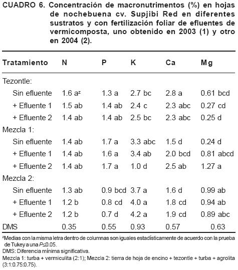 La concentración nutrimental en las hojas dependió del elemento evaluado y la naturaleza del sustrato, más que de la fertilidad de los efluentes foliares. No se observó un efecto contundente de los efluentes asperjados, en las concentraciones nutrimentales en las hojas, pero si se observó (Cuadro 3) un efecto favorable sobre la acumulación de biomasa y sobre el área foliar y de brácteas, lo cual puede reflejar un efecto de dilución nutrimental. Además hay que considerar que la aplicación de la solución nutritiva en los tratamientos con tezontle y con la mezcla 1, mantuvo a los elementos en forma disponible y suficiente para cubrir las necesidades de la planta, lo que explica que los tratamientos sin fertilización foliar presentaron concentraciones estadísticamente similares a las obtenidas con los tratamientos con la aspersión de los efluentes. El estado nutrimental de las plantas y disponibilidad en los elementos en el sustrato son factores que afectan la absorción de minerales aplicados foliarmente; cuando un elemento es deficiente en el suelo o sustrato la aplicación foliar de este elemento es más eficiente (Marschner, 1995). La aplicación de sustancias húmicas promueve mayor transporte de elementos a través de las membranas celulares (Chen y Aviad, 1990); sin embargo, en algunos trabajos con plantas herbáceas, las sustancias húmicas no tuvieron efecto en la absorción de elementos como el K, Ca y Mg y al contrario, disminuyeron la absorción de Fe, Mn, Cu y Zn (Kreij y Basar, 1995), lo cual concuerda con los resultados obtenidos en este trabajo. También es importante mencionar que las aplicaciones foliares de los dos efluentes, no tienen la posibilidad de causar manchado de brácteas, debido a la baja concentración en que se usaron; a concentraciones mayores será conveniente dejar de aplicar los efluentes cuando se inicia la pigmentación de las brácteas.