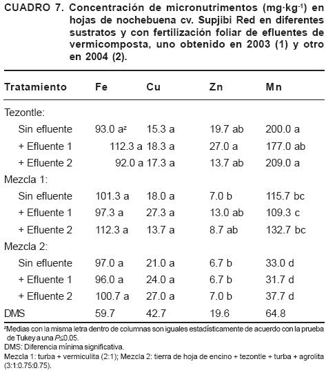 No hubo efecto significativo de los tratamientos en la concentración de Fe y Cu (Cuadro 7). La mayor concentración de Zn fue de 27 mg·kg1 y se presentó con el tratamiento de tezontle más efluente 1. La mejor concentración de Mn (209 mg·kg1) se alcanzó en el tratamiento correspondiente a tezontle más efluente 2, mostrando igualdad estadística con los valores de los tratamientos de tezontle sin aspersión foliar y tezontle más efluente 1.