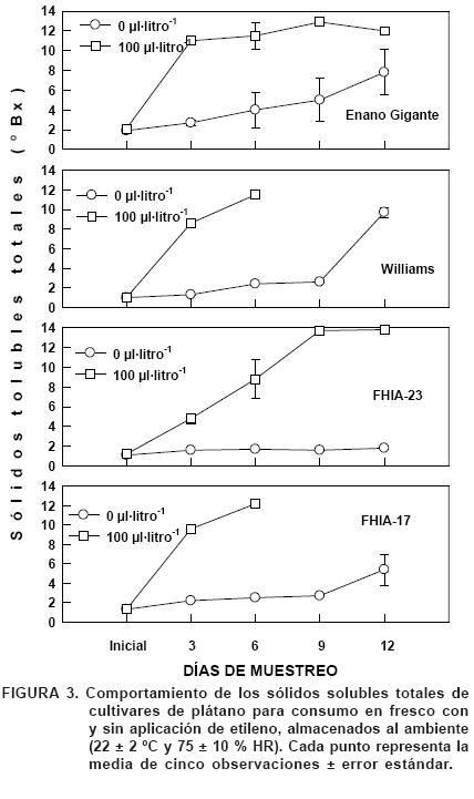 Es importante resaltar que la respuesta al etileno es dependiente del cultivar (Dadzie y Orchard, 1996) y que el cambio más obvio en respuesta al etileno es el cambio de color de cáscara. En lo concerniente a la respuesta de los cultivares a la aplicación del etileno, el único que mostró un patrón de evolución de color de cáscara similar al Enano Gigante fue el FHIA23 pero el cambio de color de FHIA23 fue menos acelerado que el de Enano Gigante ya que éste mostró desde el día seis de almacenamiento valores equivalentes al estándar ideal de consumo, lo cual fue alcanzado por FHIA23 hasta el día nueve, lo que le confiere hasta tres días adicionales de vida de anaquel. Williams y FHIA17 fueron muy susceptibles a la aplicación del etileno, ya que desde el día tres de almacenamiento ambos alcanzaron el estado ideal de consumo denotando una muy corta vida de anaquel.