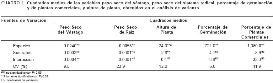 En todas las variables se observó significancia estadística en el factor especies, mientras que en el factor sustrato no se observaron efectos significativos, a excepción de la altura de planta (Cuadro 1). La interacción especie × sustrato fue significativa sólo en el peso seco del vástago, mientras que en el resto de las variables no hubo significancia.