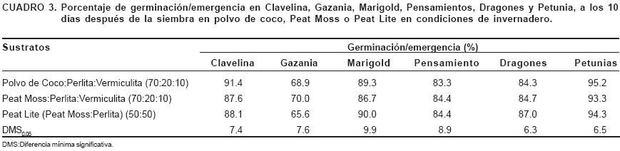 Las semillas de las seis especies ornamentales sembradas en la mezcla conteniendo polvo de coco germinaron/emergieron en porcentaje muy similar al mostrado en sustratos a base de Peat Moss, como lo indica la diferencia no significativa entre sustratos (Cuadro 3); esto sugiere que los requerimientos para la germinación/ emergencia de las especies evaluadas son cubiertos por el polvo de coco. Entre los principales factores que afectan la tasa de germinación se encuentra la disponibilidad de agua a baja tensión, lo que permite la imbibición rápida de las semillas (Koranski y Laffe, 1994). La alta tasa de germinación en el polvo de coco se puede deber a su alta capacidad de retención de humedad y alto espacio poroso, en comparación con aquellos elaborados con Peat Moss, como lo han reportado Stamps y Evans (1997). De acuerdo a Evans et al. (1996), en el polvo de coco el espacio poroso con agua puede variar entre 73 y 85%, en tanto que la capacidad de retención de humedad puede fluctuar entre 750 y 1,100%, con base en peso seco.