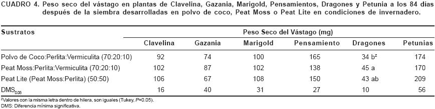 El porcentaje de germinación, el peso seco del vástago y de la raíz, además del porcentaje de plantas comerciales, no fueron afectados por ninguno de los sustratos en estudio (Cuadro 2), lo que indica que las plantas desarrolladas usando el polvo de coco como principal componente del sustrato son de la misma calidad a las obtenidas en sustratos a base de Peat Moss o en Peat Lite. En promedio, la altura de las plantas fue significativamente menor en las plantas desarrolladas en polvo de coco, comparado con las crecidas en Peat Lite (10%) y el Peat Moss (12%).
