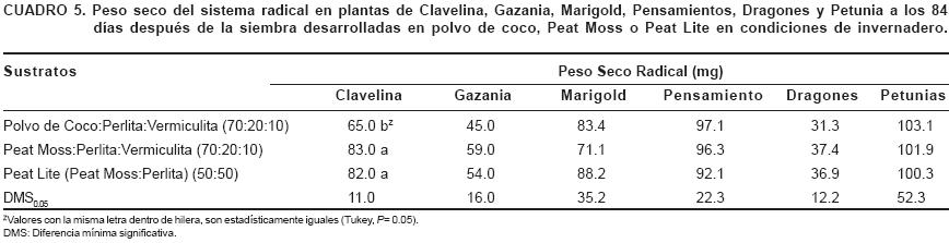El peso seco del vástago en Clavelina, Gazania, Marigold, Pensamiento y Petunia, no fue afectado significativamente por el tipo de sustrato en el que se desarrollaron las plantas (Cuadro 4). En el caso de los Dragones, al comparar el peso seco del vástago obtenido por plantas desarrolladas en polvo de coco con relación a las plantas desarrolladas en Peat Moss y Peat Lite, se observó una disminución significativa del 24 y 21%, respectivamente. En cuanto al peso seco del sistema radical, con excepción de la Clavelina, tampoco se observaron diferencias significativas entre los sustratos evaluados en el resto de las especies en estudio (Cuadro 5). El peso seco de raíz en plantas de Clavelina desarrolladas en polvo de coco fue 22 y 21% menor al obtenido en plantas crecidas en Peat Moss y Peat Lite.