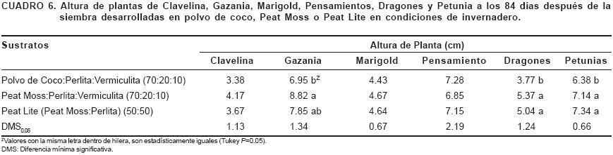 La altura de planta fue significativamente menor en Gazania, Dragones y Petunias desarrolladas en polvo de coco (Cuadro 6). La reducción en altura fue de 21, 30 y 11% con relación al Peat Moss para Gazania, Dragones y Petunia, respectivamente, y de 11, 25 y 13% con relación al Peat Lite. En Clavelina, Marigold y Pensamiento, no se obtuvo significancia estadística entre los sustratos evaluados, lo que indica que en estas especies las plantas obtenidas en polvo de coco son de altura comparable a aquellas obtenidas en sustratos a base de Peat Moss.