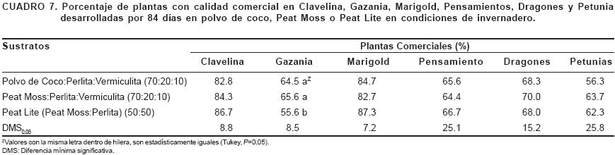 El porcentaje de plantas con calidad para ser comercializadas no fue afectado significativamente en las seis especies evaluadas (Cuadro 7), indicando que las plantas producidas en polvo de coco son de la misma calidad que aquellas obtenidas en sustratos elaborados a base de Peat Moss. Incluso en gazania existe un 10% más de plantas comerciales, comparado con el porcentaje obtenido en Peat Lite. Pill y Ridley (1998) evaluaron la eficacia del polvo de coco para sustituir el Sphagnum peat en la producción de plantas de Coreopsis lanceolata y Lycopersicon esculentum, reportando diferencias no significativas entre ambos sustratos durante las cinco semanas de crecimiento, por lo que concluyen que el polvo de coco es una alternativa adecuada para sustituir al Sphagnum peat.