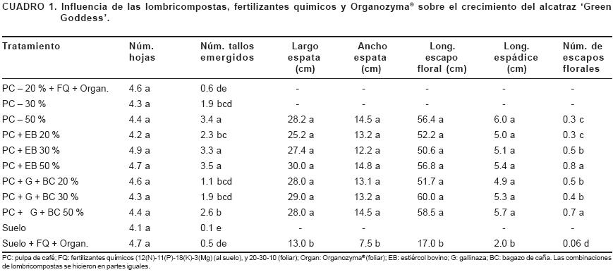 CruzCastillo et al. (2001), mostraron que el tratamiento de 12(N)11(P)18(K)3(Mg) (al suelo), y 203010 (foliar) + Organozyma® (foliar) fue más eficiente en la producción de hijuelos del alcatraz 'Green Goddess' que otras concentraciones de fertilizantes. En ese trabajo, el sustrato utilizado fue aserrín descompuesto y suelo. Además, el número de aplicaciones de fertilizante fue mayor. En el presente estudio, esa formulación fue mezclada con pulpa de café 20% y su efecto en el crecimiento del alcatraz fue significantemente menor que empleando vermicompostas a mayores concentraciones (Cuadro 1). Considerando que la disponibilidad de nutrientes en nuestro estudio fue menor debido a que el número de fertilizaciones fue solamente una vez por mes, el incremento de aplicaciones del fertilizante químico podría acelerar el crecimiento del alcatraz. Ngamau (2001a) aumentó el número de hijuelos del alcatraz 'Green Goddess' acrecentando la frecuencia de fertilización química a dos veces por semana. Otros efectos provenientes de características químicas, físicas y microbiológicas de la materia orgánica (Hodges, 1991) favoreciendo el desarrollo del alcatraz no deben descartarse.