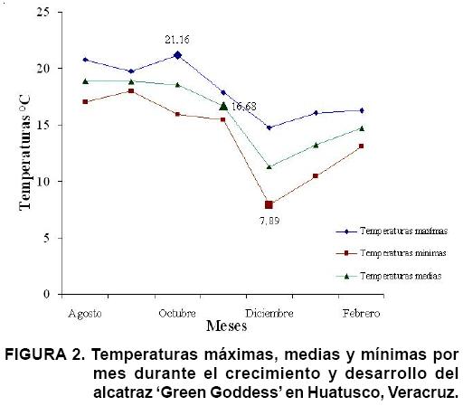 Las Unidades Calor Acumuladas desde el transplante cuando las plantas medían 15 cm (agosto) de longitud hasta la cosecha (febrero) se registraron 1717 Unidades Calor con un punto crítico de 7 °C. Con esta información se pueden construir modelos para predecir fechas de corte. La temperatura promedio mensual máxima, mínima y media durante el crecimiento y desarrollo del cultivo fueron de 21.1 °C (octubre), 7.8 °C (diciembre) y 16.6 °C (noviembre), respectivamente (Figura 2). El promedio de todas las temperaturas nocturnas y diurnas fue de 12.1 °C y 15.05 °C, respectivamente, así, se tuvo un diferencial de temperaturas de 2.95 °C durante el crecimiento y desarrollo del alcatraz.