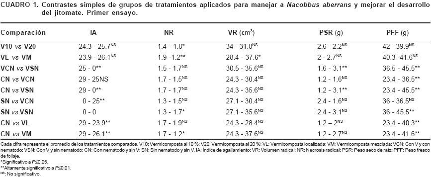La comparación de medias de tratamientos en los ensayos de invernadero se hizo mediante la prueba de contrastes, mientras que para el ensayo en campo, se realizó mediante la prueba de Tukey. Para el experimento de campo también se realizaron regresiones lineales simples con la finalidad de determinar la relación entre el peso seco de raíz, peso seco de follaje, índice de agallamiento, volumen radical y necrosis radical. Los análisis se hicieron utilizando el paquete computacional SAS (Statistical Analisis System, 2000).