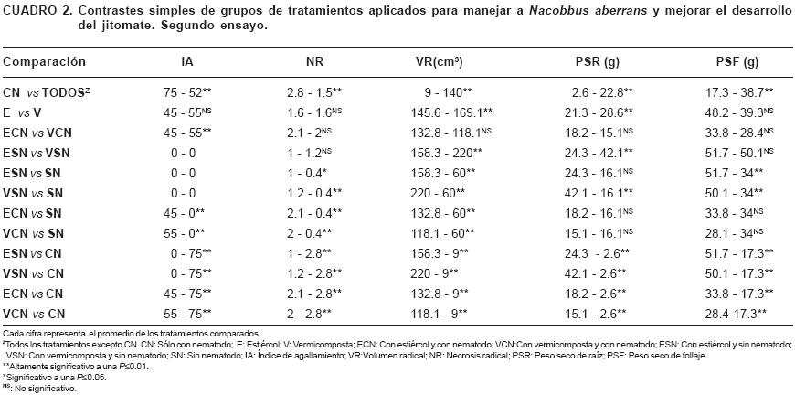 En el segundo experimento la incorporación de mejoradores orgánicos (estiércol o vermicomposta) redujo significativamente el agallamiento y necrosis radical e incrementó el VR, el PSR y el PSF, como lo indican los resultados de la comparación del tratamiento CN (sólo con nematodo y sin materia orgánica) contra todos los tratamientos que involucraron la incorporación de estiércol o vermicomposta (Cuadro 2).