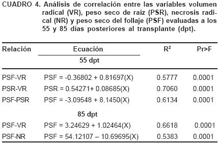 A los 55 días después del transplante se encontró una correlación positiva tanto entre el volumen radical (VR) y el peso seco del follaje y de la raíz (PSR y PSF), como entre el PSR y el PSF (Cuadro 4). A los 85 días posteriores al transplante el VR se correlacionó positivamente con el PSF y la correlación entre NR y PSF fue negativa (Cuadro 4). Es de esperar que a mayor cantidad de raíces exista un mejor desarrollo de la planta y que a medida que se incremente la muerte de raíces se afecte la absorción de agua y nutrimentos y se reduzca el desarrollo del dosel vegetal.