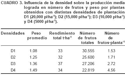 Estos resultados podrían explicarse por la posible diferencia en el número de flores y en consecuencia de frutos, que habrían producido las plantas en respuesta a las distintas densidades. Para los distintos marcos de plantación se pudo observar que existe interacción entre la densidad y el número de frutos por plantas, habiéndose encontrado que con la mayor densidad se pudo llegar a lograr una variación de aproximadamente 200%, con D3 de 77%, con D2 12%, tomando como referencia la mayor densidad (Cuadro 3). Similares resultados fueron encontrados por Caraza (1999), en donde con la mayor densidad se lograron frutos de mayor diámetro y mayor producción por planta. Este comportamiento indicaría que la decisión de la densidad a utilizar al momento de la planificación de un cultivo debe tomarse en función de los requerimientos del mercado respecto del tamaño de los frutos, teniendo en cuenta que los frutos de mayor calibre pueden ser comercializados de inmediato, mientras que los de menores calibres requieren un almacenamiento previo.