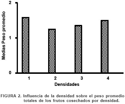 El ensayo permitió lograr entre 2 y 3 frutos·m2. La mayor densidad (D1) permitió lograr 30.555 frutos promedio por ha, D3 con 27,206 frutos seguidos de la D2 con 25,600 frutos, y D4 con 22,819 frutos·ha1.