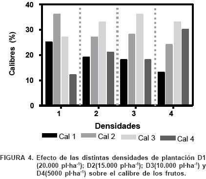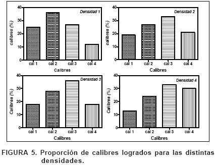 En todas las densidades estudiadas es posible obtener calibres intermedios en mayor proporción destacándose C3 en D3 y D4 y C2 en D1 (Figura 5).