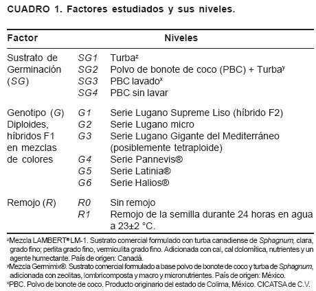 Se estudió el efecto de los factores sustrato, genotipo y remojo de la semilla (Cuadro 1), en un arreglo factorial 4 x 6 x 2. Los 48 tratamientos se alojaron en un Diseño de Bloques Completos al Azar, con tres repeticiones. Se utilizaron charolas de germinación de poliestireno con 200 cavidades cónicas de 22 ml de capacidad.