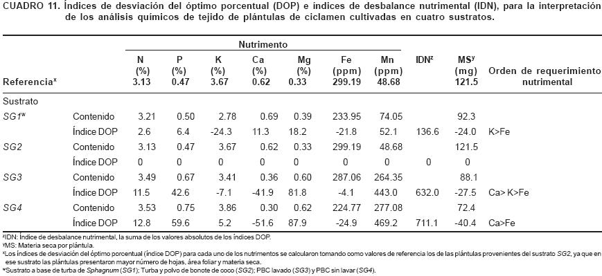 A mayor índice de desbalance nutrimental (IDN) menor producción de MS (Cuadro 11). Los índices de desviación del óptimo porcentual (DOP) y el orden de requerimiento nutrimental indican que las deficiencias de K y Fe limitaron el crecimiento de las plántulas en SG1. Las plántulas en SG3 fueron afectadas por la deficiencia de Ca principalmente y en SG4 por las de Ca y Fe.