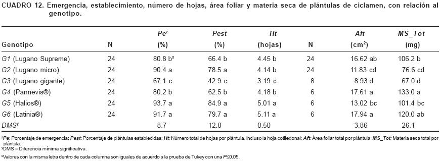 Por el número de hojas se distinguen tres grupos de genotipos: G5 y G6 con alrededor de 5; G1, G2 y G4 con alrededor de 4.25; y G3 con 3.2 hojas en total. Por el área foliar y la materia seca totales, se distinguen tres grupos: Plántulas grandes, G4 y G6; plántulas medianas, G1 y G5; y plántulas chicas, G2 y G3. Los dos últimos genotipos presentan la menor cantidad de área foliar y MS, pero por diferentes razones: G2 es una serie de las llamadas "mini", por lo tanto su porte es pequeño, en cambio G3 es una serie "gigante" pero, por lo que se ha visto, más lenta en su crecimiento inicial.