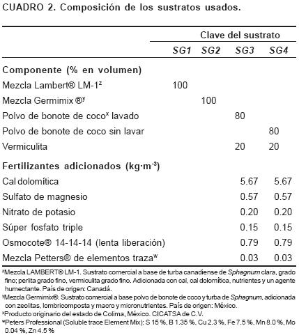 La aplicación de fertilizantes se hizo con base en la recomendación de Widmer (1992) para turba, aunque para SG3 y SG4 fue mayor la de Osmcote® 141414, porque de manera manual se puso una esfera del producto por cavidad, equivalente a 790 g·m3.