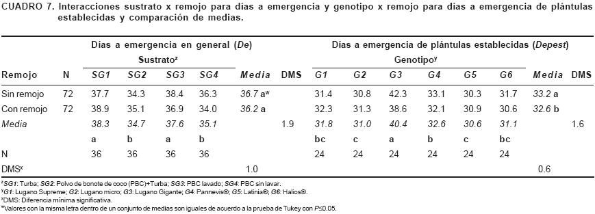 El tiempo que les llevó a las plántulas establecidas emerger (Depest) fue en promedio 33 días, con un coeficiente de variación (CV) de 12%. Ese bajo CV indica que la emergencia de esas plántulas se concentró en unos pocos días alrededor de esa cifra, tal que las plántulas que logran establecerse emergen antes de los 37 dds. Lo anterior difiere con lo que dice Widmer (1992) en el sentido de que deben desecharse las plántulas que toman más de 45 días para germinar (emerger) pues no producen plantas de calidad. Tal intervalo de tiempo está determinado por el genotipo, pues mientras que las plántulas establecidas de G3 emergieron a los 40.4 días, las otras series emergieron en promedio a los 31.4 días. La interacción genotipo x remojo se manifiesta en que el remojo de las semillas de G3, G4 y G6 causó que disminuyera en 2.7, 1.0 y 1.1 días, respectivamente, el tiempo a la emergencia (Depest) (Cuadro 7).
