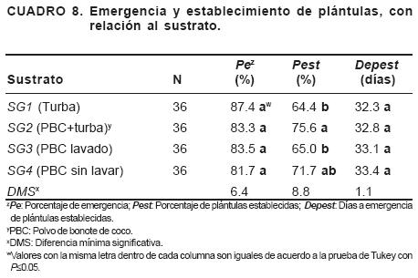En los cuatro sustratos se obtienen similares Pe, pero el Pest es más bajo en SG1 y SG3 (Cuadro 8). En esos sustratos lleva más tiempo la emergencia (De) (Cuadro 7) y además al inicio del experimento su pH se encontraba un poco por arriba del considerado óptimo y presentan los mayores valores de CC, ambos por arriba de lo óptimo (Cuadro 4). Parece evidente que la mayor cantidad de agua en el sustrato no afectó el porcentaje de emergencia, y quizá tampoco el de la germinación, pero provocó que la emergencia llevara más tiempo (Figura 1a) y que el porcentaje de plántulas establecidas disminuyera en alrededor de 10% (Figura 1b).